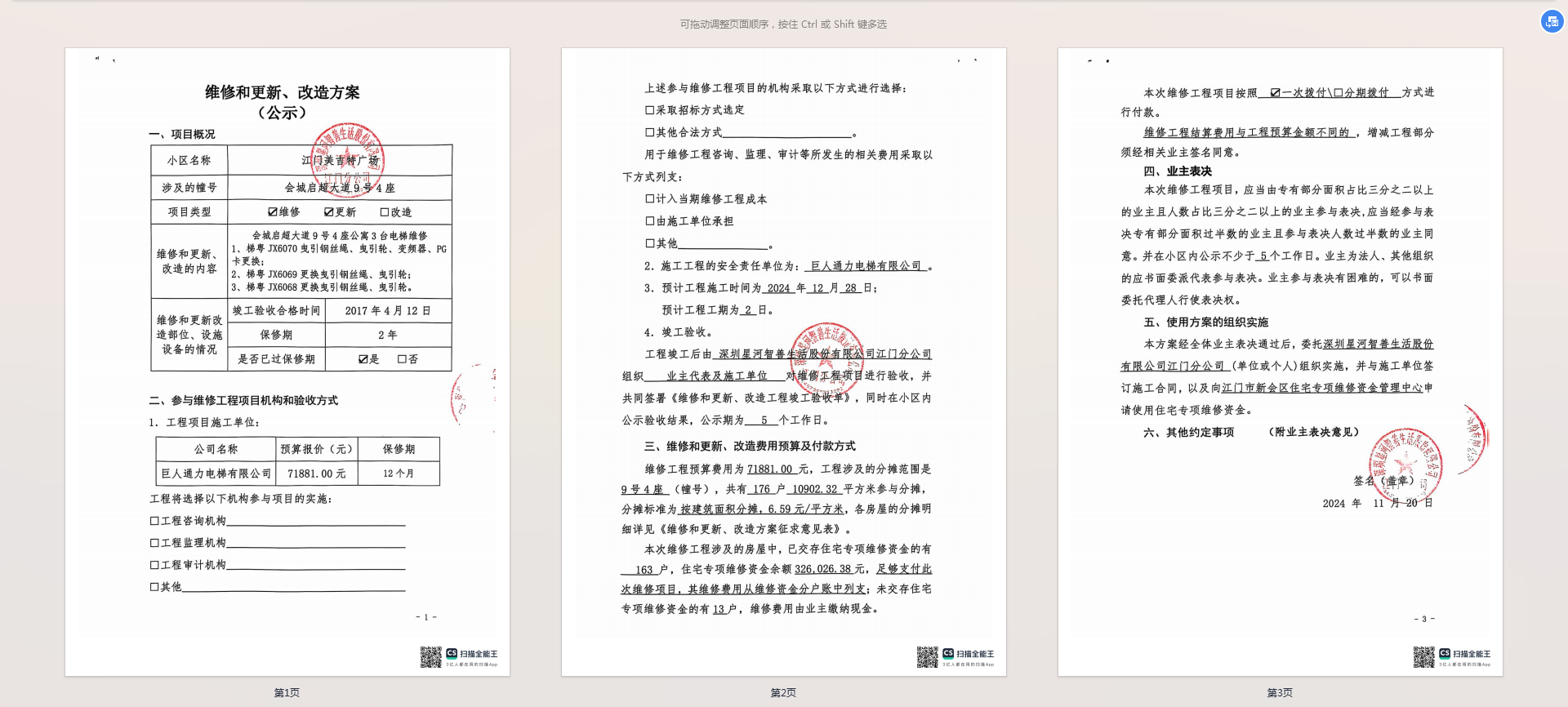 <td VALIGN="top" VALUES="" STYLE="border-width:0" BINDTYPE="0" ROWSPAN="17" COLSPAN="7" DATASOURCE="投票结果" ><font style=" font-family:方正小标宋简体;font-size:14pt;"><p style="line-height: 1.75em;"><span style="font-family: 宋体, SimSun;">各位尊敬的业主:</span><br/></p><p style="text-indent: 2em; line-height: 1.75em;"><span style="font-family: 宋体, SimSun;">根据法律法规的规定,本小区业主利用“江门市物业事项表决管理系统”已对本小区公共事务决策事项进行了表决,在经过7日的询异公示期后,未收到业主有效的异议。现将投票结果公告,并就产生的法律效力说明如下:</span></p><p style="line-height: 1.75em; text-indent: 0em;"><strong style="text-indent: 2em;"><span style="font-family: 宋体, SimSun;">一、投票范围</span></strong></p><p style="text-indent: 2em; line-height: 1.75em;"><span style="font-family: 宋体, SimSun;">江门美吉特广场会城启超大道9号4座</span></p><p style="text-indent: 2em; line-height: 1.75em;"><span style="font-family: 宋体, SimSun;">总人数(专有部分人数之和):154</span></p><p style="text-indent: 2em; line-height: 1.75em;"><span style="font-family: 宋体, SimSun;"><span style="font-family: 宋体, SimSun; text-indent: 32px;"><span style="font-family: 宋体; text-indent: 32px;"><span style="font-family: 宋体; text-indent: 32px;">总户数:176</span></span></span></span></p><p style="text-indent: 2em; line-height: 1.75em;"><span style="font-family: 宋体, SimSun;">建筑物总面积(专有部分面积之和):10902.32㎡</span></p><p style="line-height: 1.75em;"><strong><span style="font-family: 宋体, SimSun;">二、投票结果公告时间</span></strong></p><p style="text-indent: 2em; line-height: 1.75em;"><span style="font-family: 宋体, SimSun;"><span style="font-family: 宋体, SimSun; text-indent: 32px;">从2024年12月25日开始</span></span></p><p style="line-height: 1.75em;"><strong><span style="font-family: 宋体, SimSun;">三、计票规则</span></strong></p><p style="text-indent: 2em; line-height: 1.75em;"><span style="font-family: 宋体, SimSun;">表决事项:使用建筑物及其附属设施的维修资金<br /><p style='font-family: 宋体, SimSun;line-height: 1.75em; text-indent: 2em;'>计票规则:弃权票不并入其它项&nbsp;&nbsp;&nbsp;&nbsp;未表决票不并入其它项</p></span></p><p style="line-height: 1.75em;"><strong><span style="font-family: 宋体, SimSun;">四、通过规则</span></strong></p><p style="line-height: 1.75em;"><strong><span style="font-family: 宋体, SimSun;">&nbsp; 根据《中华人民共和国民法典》第二百七十八条规定:业主共同决定事项,应当由专有部分面积占比三分之二以上的业主且人数占比三分之二以上的业主参与表决。</span></strong></p><p style="text-indent: 2em; line-height: 1.75em;"><span style="font-family: 宋体, SimSun;"><span style="font-family: 宋体, SimSun; text-indent: 32px;">表决事项:使用建筑物及其附属设施的维修资金<br /><p style='font-family: 宋体, SimSun;line-height: 1.75em; text-indent: 2em;'>通过规则:双2/3以上参与表决,参与表决双过半同意</p></span></span></p><p style="line-height: 1.75em;"><strong><span style="font-family: 宋体, SimSun;">五、投票结果</span></strong></p><p style="line-height: 1.75em; text-indent: 2em;"><span style="font-family: 宋体, SimSun; text-indent: 2em;"><div id='resultTable'><table style='table-layout: fixed; font-size:12px; margin-top:10px' width='100%' border='0' cellspacing='0' cellpadding='0'><tr><td height='28' colspan='10' align='center' style='border: 1px solid #666'><strong style='font-size: 14px;'> 使用建筑物及其附属设施的维修资金</strong></td> </tr><tr id='trfirst'><td height='28' colspan='4' style='border-left: 1px solid #666; border-bottom: 1px solid #666'><strong>&nbsp;申报单位:</strong> 深圳星河智善生活股份有限公司江门分公司</td><td colspan='3' style='border-left: 1px solid #666; border-bottom: 1px solid #666'><strong>&nbsp;联系方式:</strong> (0750) 3871336 3829717 </td><td colspan='3' style='border-left: 1px solid #666; border-bottom: 1px solid #666; border-right: 1px solid #666'><strong>&nbsp;申报日期:</strong> 2024年12月2日 </td></tr><tr> <td height='28' colspan='5' style='border-left: 1px solid #666; border-bottom: 1px solid #666'><strong>&nbsp;列支总人数(专有部分人数之和):</strong>154人 </td><td colspan='5' style='border-left: 1px solid #666; border-bottom: 1px solid #666; border-right: 1px solid #666'><strong>&nbsp;列支建筑物总面积(专有部分面积之和):</strong>10902.32㎡ </td> </tr><tr><td height='28' colspan='10' bgcolor='#F3F3F3' style='border-left: 1px solid #666;border-bottom: 1px solid #666;border-right: 1px solid #666'><strong>&nbsp;参与表决人数及面积统计</strong></td></tr><tr><td height='28' colspan='5' style='border-left: 1px solid #666; border-bottom: 1px solid #666'><strong>&nbsp;参与表决人数:</strong>110人</td><td colspan='5' style='border-left: 1px solid #666; border-bottom: 1px solid #666; border-right: 1px solid #666'><strong>&nbsp;参与表决人数占总人数比例:</strong>71.43%</td></tr><tr><td height='28' colspan='5' style='border-left: 1px solid #666; border-bottom: 1px solid #666'><strong>&nbsp;参与表决面积:</strong>7791.41㎡</td><td colspan='5' style='border-left: 1px solid #666; border-bottom: 1px solid #666; border-right: 1px solid #666'><strong>&nbsp;参与表决面积占总面积比例:</strong>71.47%</td></tr><tr><td height='28' colspan='10' bgcolor='#F3F3F3' style='border-left: 1px solid #666; border-bottom: 1px solid #666;border-right: 1px solid #666'> <strong>&nbsp;参与表决同意人数及面积统计</strong></td> </tr><tr><td height='28' colspan='5' style='border-left: 1px solid #666; border-bottom: 1px solid #666'><strong>&nbsp;参与表决同意人数:</strong>110人 </td><td 