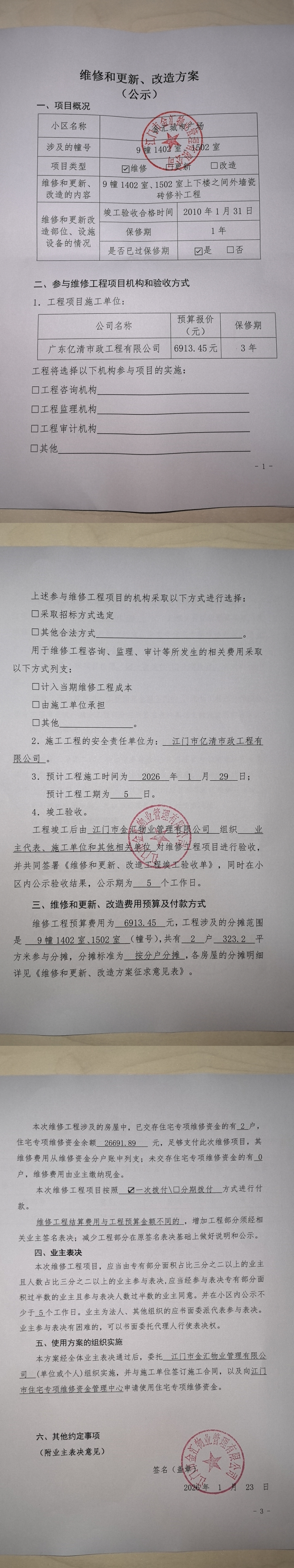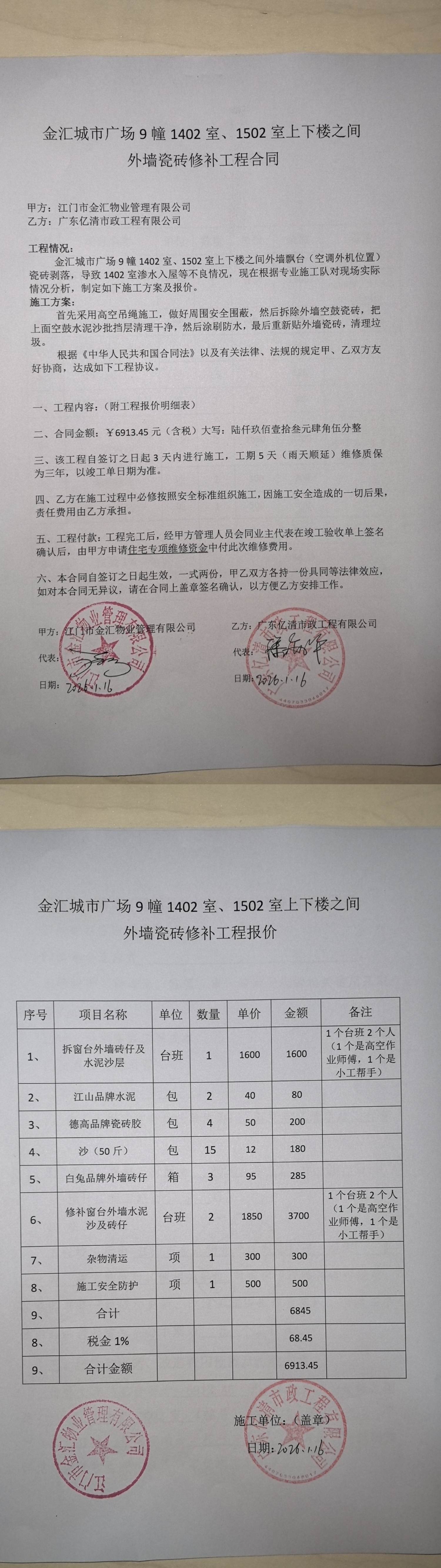 <td VALIGN="top" VALUES="" STYLE="border-width:0" BINDTYPE="0" ROWSPAN="19" COLSPAN="7" DATASOURCE="投票结果" ><font style="font-size:14pt;"><p style="white-space: normal; font-family: 宋体; line-height: 1.75em;">金汇城市广场金汇城市广场9栋全体业主:</p><p style="white-space: normal; font-family: 宋体; line-height: 1.75em; text-indent: 2em;">本小区关于金汇城市广场关于9幢1402室、1502室上下楼之间外墙瓷砖修补工程申请维修资金的投票的投票已表决结束,询异时间从2026年01月30日开始,投票询异公示期间,业主可通过微信查询自己的表决情况或可凭身份证件申请查询自己的表决情况;如公示的业主表决情况与查询的本人表决意见不一致的,可以以书面形式向投票组织机构申诉,投票组织机构予以纠正并重新公示表决结果。异议提出人对投票组织机构的处理仍有异议的,可以向街道办事处(镇人民政府)反映处理,涉及住宅专项维修资金的,可向属地住宅专项维修资金管理中心反映处理。</p><p style="white-space: normal;"><br/></p><p style="white-space: normal; font-family: 宋体; line-height: 1.75em;"><strong>附件:</strong></p><p style="white-space: normal; font-family: 宋体; line-height: 1.75em;"><strong>一、投票范围</strong></p><p style="white-space: normal; font-family: 宋体; line-height: 1.75em; text-indent: 2em;">金汇城市广场金汇城市广场9栋</p><p style="white-space: normal; font-family: 宋体; line-height: 1.75em; text-indent: 2em;">总人数(专有部分人数之和):2</p><p style="white-space: normal; font-family: 宋体; line-height: 1.75em; text-indent: 2em;"><span style="font-family: 宋体, SimSun;"><span style="font-family: 宋体; text-indent: 32px;"><span style="font-family: 宋体; text-indent: 32px;">总户数:2</span></span></span></p><p style="white-space: normal; font-family: 宋体; line-height: 1.75em; text-indent: 2em;">建筑物总面积(专有部分面积之和):323.20㎡</p><p style="white-space: normal; font-family: 宋体; line-height: 1.75em;"><strong>二、询异公示起止时间</strong></p><p dir="ltr" style="white-space: normal; font-family: 宋体; line-height: 1.75em; text-indent: 2em;"><span style="text-indent: 36px;">2026年01月30日至2026年02月06日</span></p><p style="white-space: normal; font-family: 宋体; line-height: 1.75em;"><strong>三、投票详细描述</strong></p><p style="white-space: normal; font-family: 宋体; line-height: 1.75em; text-indent: 2em;"><p> 金汇城市广场9幢1402室、1502室上下楼之间外墙飘台(空调外机位置)瓷砖剥落,导致1402室渗水入屋等不良情况,严重影响业主正常生活。现在根据专业施工队对现场实际情况分析,9幢1402室、1502室上下楼之间外墙飘台公共区域的墙壁、地面、管道等全部重新做防水修复清理等相关处理。工程维修预算金额为6913.45元,项目最终费用以施工合同签订金额为准。维修费用的分摊标准为按分户分摊,详见公示附件。物业公司联系电话:3929003。</p></p><p style="white-space: normal; font-family: 宋体; line-height: 1.75em;"><strong>四、计票规则</strong></p><p style="white-space: normal; font-family: 宋体; line-height: 1.75em; text-indent: 2em;">表决事项:使用建筑物及其附属设施的维修资金<br /><p style='text-align: left; font-family: 宋体; font-size: 16px; line-height: 1.75em; text-indent: 2em;'>计票规则:弃权票不并入其它项 未表决票不并入其它项</p></p><p style="white-space: normal; font-family: 宋体; line-height: 1.75em;"><strong>五、通过规则</strong></p><p style="white-space: normal; font-family: 宋体; line-height: 1.75em;"><strong><strong style="white-space: normal;"><span style="font-family: 宋体, SimSun;"> 根据《中华人民共和国民法典》第二百七十八条规定:业主共同决定事项,应当由专有部分面积占比三分之二以上的业主且人数占比三分之二以上的业主参与表决。</span></strong></strong></p><p style="white-space: normal; font-family: 宋体; line-height: 1.75em; text-indent: 2em;">表决事项:使用建筑物及其附属设施的维修资金<br /><p style='text-align: left; font-family: 宋体; font-size: 16px; line-height: 1.75em; text-indent: 2em;'>通过规则:双2/3以上参与表决,参与表决双过半同意</p></p><p style="white-space: normal; font-family: 宋体; line-height: 1.75em;"><strong>六、投票结果</strong></p><p style="white-space: normal; font-family: 宋体; line-height: 1.75em; text-indent: 2em;"><div id='resultTable'><table style='table-layout: fixed; font-size:12px; margin-top:10px' width='100%' border='0' cellspacing='0' cellpadding='0'><tr><td height='28' colspan='10' align='center' style='border: 1px solid #666'><strong style='font-size: 14px;'> 使用建筑物及其附属设施的维修资金</strong></td> </tr><tr id='trfirst'><td height='28' colspan='4' style='border-left: 1px solid #666; border-bottom: 1px solid #666'><strong> 申报单位:</strong> 江门市金汇物业管理有限公司</td><td colspan='3' style='border-left: 1px solid #666; border-bottom: 1px solid #666'><strong> 联系方式:</strong> 3929003 </td><td colspan='3' style='border-left: 1px solid #666; border-bottom: 1px solid #666; border-right: 1px solid #666'><strong> 申报日期:</strong> 2026年1月22日 </td></tr><tr> <td height='28' colspan='5' style='border-left: 1px solid #666; border-bottom: 1px solid #666'><strong> 总人数(专有部分人数之和):</strong>2人 </td><td colspan='5' style='border-left: 1px solid #666; border-bottom: 1px solid #666; border-right: 1px solid #666'><strong> 建筑物总面积(专有部分面积之和):</strong>323.20㎡ </td> </tr><tr><td height='28' colspan='10' bgcolor='#F3F3F3' style='border-left: 1px solid #666;border-bottom: 1px solid #666;border-right: 1px solid #666'><strong> 参与人数及面