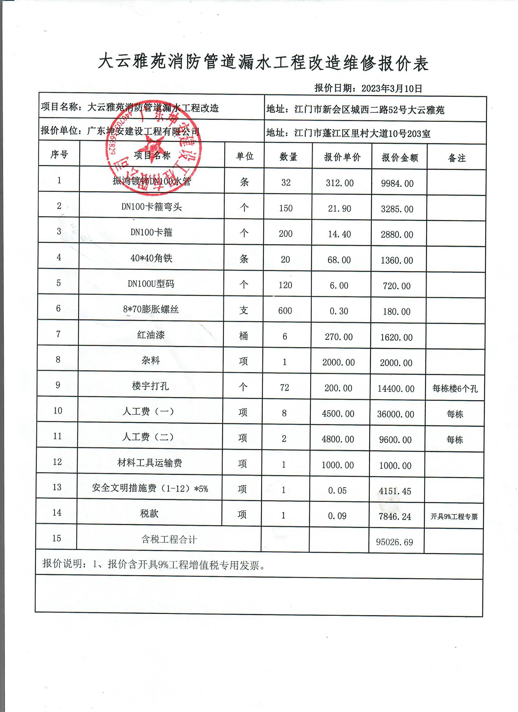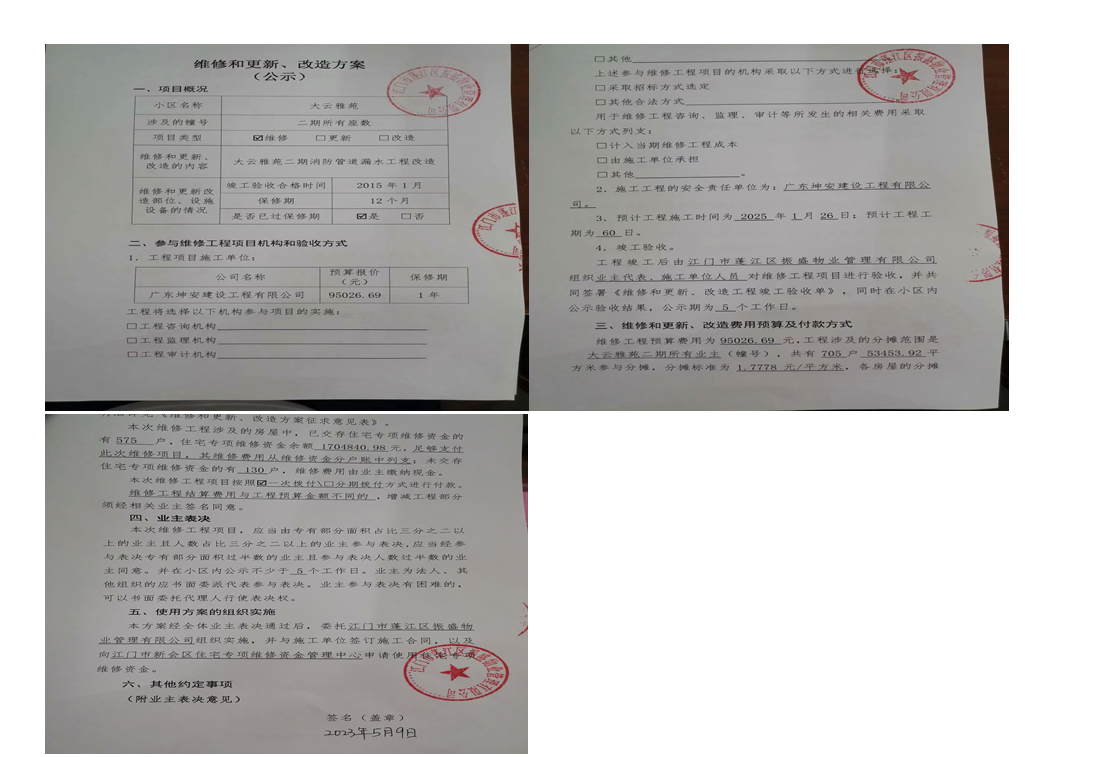 <td VALIGN="top" VALUES="" STYLE="border-width:0" BINDTYPE="0" ROWSPAN="19" COLSPAN="7" DATASOURCE="投票结果" ><font style="font-size:14pt;"><p style="white-space: normal; font-family: 宋体; line-height: 1.75em;">大云雅苑1号车库、大云雅苑11座、大云雅苑12座、大云雅苑13座、大云雅苑15座、大云雅苑16座、大云雅苑17座、大云雅苑18座、大云雅苑19座、大云雅苑20座、大云雅苑21座全体业主:</p><p style="white-space: normal; font-family: 宋体; line-height: 1.75em; text-indent: 2em;">本小区关于大云雅苑关于消防管道漏水工程改造维修资金的投票的投票已表决结束,询异时间从2024年01月01日开始,投票询异公示期间,业主可通过微信查询自己的表决情况或可凭身份证件申请查询自己的表决情况;如公示的业主表决情况与查询的本人表决意见不一致的,可以以书面形式向投票组织机构申诉,投票组织机构予以纠正并重新公示表决结果。异议提出人对投票组织机构的处理仍有异议的,可以向街道办事处(镇人民政府)反映处理,涉及住宅专项维修资金的,可向属地住宅专项维修资金管理中心反映处理。</p><p style="white-space: normal;"><br/></p><p style="white-space: normal; font-family: 宋体; line-height: 1.75em;"><strong>附件:</strong></p><p style="white-space: normal; font-family: 宋体; line-height: 1.75em;"><strong>一、投票范围</strong></p><p style="white-space: normal; font-family: 宋体; line-height: 1.75em; text-indent: 2em;">大云雅苑1号车库、大云雅苑11座、大云雅苑12座、大云雅苑13座、大云雅苑15座、大云雅苑16座、大云雅苑17座、大云雅苑18座、大云雅苑19座、大云雅苑20座、大云雅苑21座</p><p style="white-space: normal; font-family: 宋体; line-height: 1.75em; text-indent: 2em;">总人数(专有部分人数之和):490</p><p style="white-space: normal; font-family: 宋体; line-height: 1.75em; text-indent: 2em;"><span style="font-family: 宋体, SimSun;"><span style="font-family: 宋体; text-indent: 32px;"><span style="font-family: 宋体; text-indent: 32px;">总户数:705</span></span></span></p><p style="white-space: normal; font-family: 宋体; line-height: 1.75em; text-indent: 2em;">建筑物总面积(专有部分面积之和):53453.92㎡</p><p style="white-space: normal; font-family: 宋体; line-height: 1.75em;"><strong>二、询异公示起止时间</strong></p><p dir="ltr" style="white-space: normal; font-family: 宋体; line-height: 1.75em; text-indent: 2em;"><span style="text-indent: 36px;">2024年01月01日至2024年01月07日</span></p><p style="white-space: normal; font-family: 宋体; line-height: 1.75em;"><strong>三、投票详细描述</strong></p><p style="white-space: normal; font-family: 宋体; line-height: 1.75em; text-indent: 2em;"><p>本小区二区所有幢的消防地下管道漏水造成泄压,消防管道不能正常供水 ,经检查,是由于地 面下沉,导致地下消防管网破裂渗水 ,已过保修期。现需申请使用维修资金对小区二期所有地下消防管网改造维修,工程维修预算金额为 95026.69 元,项目最终费用以施工合同签订金额为准。维修费用的分摊标准为 1.7778元/平方 ,详见公示附件。如业主手机不能正常通过微信投票,请联系物业公司进行线下纸质投票,联系电话:0750-6685883</p></p><p style="white-space: normal; font-family: 宋体; line-height: 1.75em;"><strong>四、计票规则</strong></p><p style="white-space: normal; font-family: 宋体; line-height: 1.75em; text-indent: 2em;">表决事项:使用建筑物及其附属设施的维修资金<br /><p style='text-align: left; font-family: 宋体; font-size: 16px; line-height: 1.75em; text-indent: 2em;'>计票规则:弃权票不并入其它项 未表决票不并入其它项</p></p><p style="white-space: normal; font-family: 宋体; line-height: 1.75em;"><strong>五、通过规则</strong></p><p style="white-space: normal; font-family: 宋体; line-height: 1.75em;"><strong><strong style="white-space: normal;"><span style="font-family: 宋体, SimSun;">&nbsp; 根据《中华人民共和国民法典》第二百七十八条规定:业主共同决定事项,应当由专有部分面积占比三分之二以上的业主且人数占比三分之二以上的业主参与表决。</span></strong></strong></p><p style="white-space: normal; font-family: 宋体; line-height: 1.75em; text-indent: 2em;">表决事项:使用建筑物及其附属设施的维修资金<br /><p style='text-align: left; font-family: 宋体; font-size: 16px; line-height: 1.75em; text-indent: 2em;'>通过规则:参与表决专有部分面积过半数的业主且参与表决人数过半数的业主同意</p></p><p style="white-space: normal; font-family: 宋体; line-height: 1.75em;"><strong>六、投票结果</strong></p><p style="white-space: normal; font-family: 宋体; line-height: 1.75em; text-indent: 2em;"><div id='resultTable'><table style='table-layout: fixed; font-size:12px; margin-top:10px' width='100%' border='0' cellspacing='0' cellpadding='0'><tr><td height='28' colspan='10' align='center' style='border: 1px solid #666'><strong style='font-size: 14px;'> 使用建筑物及其附属设施的维修资金</strong></td> </tr><tr id='trfirst'><td height='28' colspan='4' style='border-left: 1px solid #666; border-bottom: 1px solid #666'><strong> 申报单位:</strong> 江门市蓬江区振盛物业管理有限公司</td><td colspan='3' style='border-left: 1px solid #666; border-bottom: 1px solid #666'><strong> 联系方式:</strong> 0750-6685883 </td><td colspan='3' style='border-left: 1px solid #666; border-bottom: 1px solid #666; border-right: 1px solid #666'><strong> 申报日期:</strong> 2023年5月9日 </td></tr><tr> <td height='28' colspan='5' style='border-left: 1px solid #666; border-bottom: 1px solid #666'><strong> 总人数(专有部分人数之和):</strong>490人 </