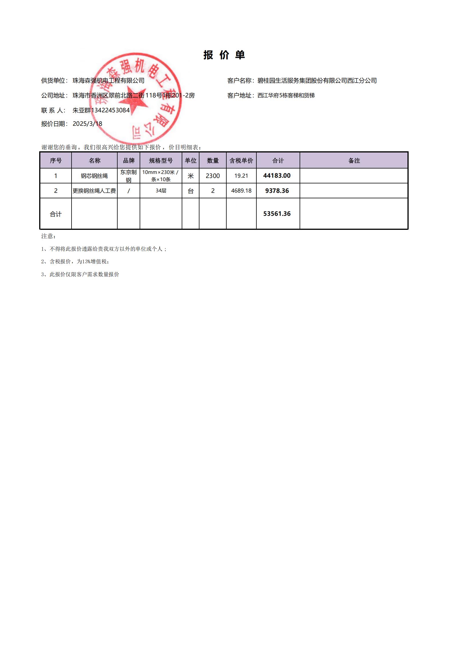 <br/>现对5幢客梯、货梯进行维修,工程维修预算金额为53561.36元,项目最终费用以施工合同签订金额为准。因已过保修期,维修费用由相关业主按建筑面积分摊,每平方约3.49元,详见公示附件。如业主手机不能正常通过微信投票,请联系物业公司进行线下纸质投票,物业电话:0750-3335388。</p></p><p style="white-space: normal; font-family: 宋体; line-height: 1.75em;"><strong>四、计票规则</strong></p><p style="white-space: normal; font-family: 宋体; line-height: 1.75em; text-indent: 2em;">表决事项:使用建筑物及其附属设施的维修资金<br /><p style='text-align: left; font-family: 宋体; font-size: 16px; line-height: 1.75em; text-indent: 2em;'>计票规则:弃权票不并入其它项 未表决票不并入其它项</p></p><p style="white-space: normal; font-family: 宋体; line-height: 1.75em;"><strong>五、通过规则</strong></p><p style="white-space: normal; font-family: 宋体; line-height: 1.75em;"><strong><strong style="white-space: normal;"><span style="font-family: 宋体, SimSun;"> 根据《中华人民共和国民法典》第二百七十八条规定:业主共同决定事项,应当由专有部分面积占比三分之二以上的业主且人数占比三分之二以上的业主参与表决。</span></strong></strong></p><p style="white-space: normal; font-family: 宋体; line-height: 1.75em; text-indent: 2em;">表决事项:使用建筑物及其附属设施的维修资金<br /><p style='text-align: left; font-family: 宋体; font-size: 16px; line-height: 1.75em; text-indent: 2em;'>通过规则:双2/3以上参与表决,参与表决双过半同意</p></p><p style="white-space: normal; font-family: 宋体; line-height: 1.75em;"><strong>六、投票结果</strong></p><p style="white-space: normal; font-family: 宋体; line-height: 1.75em; text-indent: 2em;"><div id='resultTable'><table style='table-layout: fixed; font-size:12px; margin-top:10px' width='100%' border='0' cellspacing='0' cellpadding='0'><tr><td height='28' colspan='10' align='center' style='border: 1px solid #666'><strong style='font-size: 14px;'> 使用建筑物及其附属设施的维修资金</strong></td> </tr><tr id='trfirst'><td height='28' colspan='4' style='border-left: 1px solid #666; border-bottom: 1px solid #666'><strong> 申报单位:</strong> 碧桂园生活服务集团股份有限公司西江分公司</td><td colspan='3' style='border-left: 1px solid #666; border-bottom: 1px solid #666'><strong> 联系方式:</strong> 0750-3938919 </td><td colspan='3' style='border-left: 1px solid #666; border-bottom: 1px solid #666; border-right: 1px solid #666'><strong> 申报日期:</strong> 2025年5月26日 </td></tr><tr> <td height='28' colspan='5' style='border-left: 1px solid #666; border-bottom: 1px solid #666'><strong> 总人数(专有部分人数之和):</strong>129人 </td><td colspan='5' style='border-left: 1px solid #666; border-bottom: 1px solid #666; border-right: 1px solid #666'><strong> 建筑物总面积(专有部分面积之和):</strong>15360.20㎡ </td> </tr><tr><td height='28' colspan='10' bgcolor='#F3F3F3' style='border-left: 1px solid #666;border-bottom: 1px solid #666;border-right: 1px solid #666'><strong> 参与人数及面积统计</strong></td></tr><tr><td height='28' colspan='5' style='border-left: 1px solid #666; border-bottom: 1px solid #666'><strong> 参与表决专有部分人数之和:</strong>87人</td><td colspan='5' style='border-left: 1px solid #666; border-bottom: 1px solid #666; border-right: 1px solid #666'><strong> 参与表决占有表决权总人数比例:</strong>67.44%</td></tr><tr><td height='28' colspan='5' style='border-left: 1px solid #666; border-bottom: 1px solid #666'><strong> 参与表决专有部分面积之和:</strong>10430.29㎡</td><td colspan='5' style='border-left: 1px solid #666; border-bottom: 1px solid #666; border-right: 1px solid #666'><strong> 参与表决占有表决权总面积比例:</strong>67.90%</td></tr><tr><td height='28' colspan='10' bgcolor='#F3F3F3' style='border-left: 1px solid #666; border-bottom: 1px solid #666;border-right: 1px solid #666'> <strong> 参与表决同意人数及面积统计</strong></td> </tr><tr><td height='28' colspan='5' style='border-left: 1px solid #666; border-bottom: 1px solid #666'><strong> 参与表决同意人数:</strong>87人 </td><td colspan='5' style='border-left: 1px solid #666; border-bottom: 1px solid #666; border-right: 1px solid #666'><strong> 参与表决同意人数占参与表决人数比例:</strong>100.00%</td></tr><tr><td height='28' colspan='5' style='border-left: 1px solid #666; border-bottom: 1px solid #666'><strong> 参与表决同意面积:</strong>10430.29㎡</td><td colspan='5' style='border-left: 1px solid #666; border-bottom: 1px solid #666; border-right: 1px solid #666'><strong> 参与表决同意面积占参与表决面积比例:</strong>100.00% </td> </tr><tr><td width='6%' rowspan='2' align='center' bgcolor='#F3F3F3' style='border-left: 1px solid #666; border-bottom: 1px solid #666'><strong>序号</strong></td><td width='11%' rowspan='2' align='center' bgcolor='#F3F3F3' style='border-left: 1px solid #666; border-bottom: 1px solid #666'><strong>候选项</strong></td><td height='28' colspan='2' align='center' bgcolor='#F3F3F3' style='border-left: 1px solid #666; border-bottom: 1px solid #666'><strong>表决人数情况</strong> </td><td colspan='2' align='center' bgcolor='#F3F3F3' style='border-left: 1px solid #666; border-bottom: 1px solid #666'><strong>表决面积情况</strong></td><td colspan='4' align='center' bgcolor='#F3F3F3' style='border-left: 1px solid #666; border-bottom: 1px solid #666; border-right: 1px solid #666'><strong>表决方式</strong></td></tr><tr><td width='11%' height='28' align='center' bgcolor='#F3F3F3' style='border-left: 1px solid #666;border-bottom: 1px solid #666'><strong>参与表<br />决人数</strong> </td><td width='11%' align='center' bgcolor='#F3F3F3' style