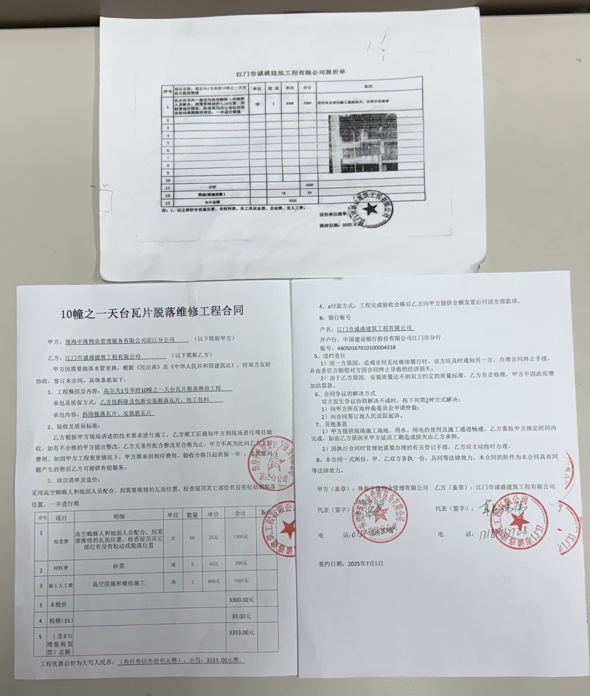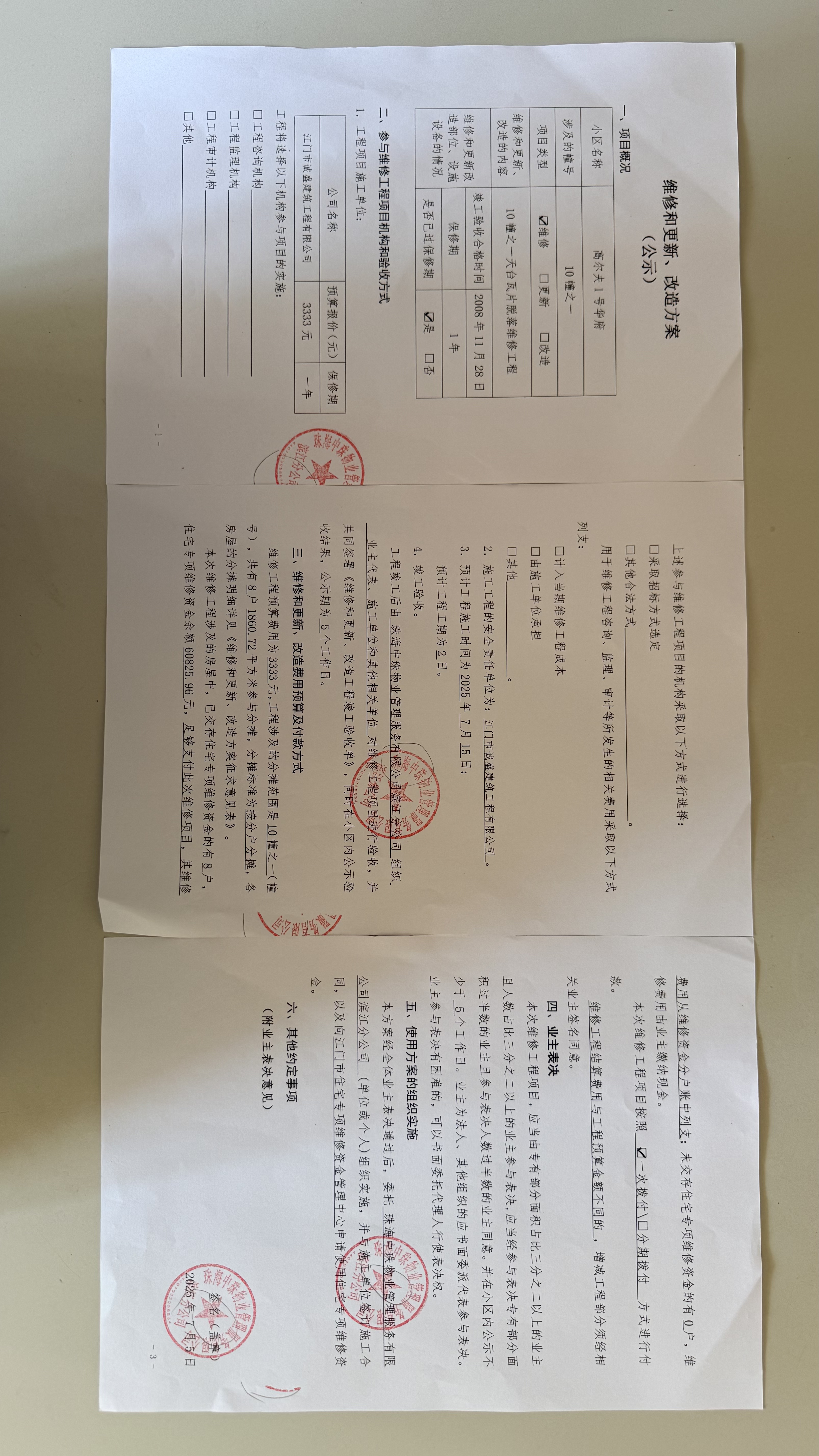 <td VALIGN="top" VALUES="" STYLE="border-width:0" BINDTYPE="0" ROWSPAN="19" COLSPAN="7" DATASOURCE="投票结果" ><font style="font-size:14pt;"><p style="white-space: normal; font-family: 宋体; line-height: 1.75em;">高尔夫1号华府蓬江区绿茵豪苑高尔夫1号华府10幢之一全体业主:</p><p style="white-space: normal; font-family: 宋体; line-height: 1.75em; text-indent: 2em;">本小区关于高尔夫1号华府10幢之一天台瓦片脱落维修使用维修资金的投票的投票已表决结束,询异时间从2026年03月05日开始,投票询异公示期间,业主可通过微信查询自己的表决情况或可凭身份证件申请查询自己的表决情况;如公示的业主表决情况与查询的本人表决意见不一致的,可以以书面形式向投票组织机构申诉,投票组织机构予以纠正并重新公示表决结果。异议提出人对投票组织机构的处理仍有异议的,可以向街道办事处(镇人民政府)反映处理,涉及住宅专项维修资金的,可向属地住宅专项维修资金管理中心反映处理。</p><p style="white-space: normal;"><br/></p><p style="white-space: normal; font-family: 宋体; line-height: 1.75em;"><strong>附件:</strong></p><p style="white-space: normal; font-family: 宋体; line-height: 1.75em;"><strong>一、投票范围</strong></p><p style="white-space: normal; font-family: 宋体; line-height: 1.75em; text-indent: 2em;">高尔夫1号华府蓬江区绿茵豪苑高尔夫1号华府10幢之一</p><p style="white-space: normal; font-family: 宋体; line-height: 1.75em; text-indent: 2em;">总人数(专有部分人数之和):8</p><p style="white-space: normal; font-family: 宋体; line-height: 1.75em; text-indent: 2em;"><span style="font-family: 宋体, SimSun;"><span style="font-family: 宋体; text-indent: 32px;"><span style="font-family: 宋体; text-indent: 32px;">总户数:8</span></span></span></p><p style="white-space: normal; font-family: 宋体; line-height: 1.75em; text-indent: 2em;">建筑物总面积(专有部分面积之和):1860.72㎡</p><p style="white-space: normal; font-family: 宋体; line-height: 1.75em;"><strong>二、询异公示起止时间</strong></p><p dir="ltr" style="white-space: normal; font-family: 宋体; line-height: 1.75em; text-indent: 2em;"><span style="text-indent: 36px;">2026年03月05日至2026年03月12日</span></p><p style="white-space: normal; font-family: 宋体; line-height: 1.75em;"><strong>三、投票详细描述</strong></p><p style="white-space: normal; font-family: 宋体; line-height: 1.75em; text-indent: 2em;"><p>小区10幢之一的天面瓦片出现松动情况并脱落,经检查,是由于日久失修材料已老化导致,因使用时间较长,瓦片及固定材料原件已达到报废条件而不能使用。</p><p>现对10幢之一天台瓦片脱落情况进行维修固定,工程预算金额为3333元,项目最终费用以施工合同签订金额为准。因已过保修期,维修费用由相关业主按分户分摊,每户约416.63元,详见公示附件。如业主手机不能正常通过投票,请联系物业公司进行线下纸质投票,物业电话:0750-3068388。</p><p><br/></p></p><p style="white-space: normal; font-family: 宋体; line-height: 1.75em;"><strong>四、计票规则</strong></p><p style="white-space: normal; font-family: 宋体; line-height: 1.75em; text-indent: 2em;">表决事项:使用建筑物及其附属设施的维修资金<br /><p style='text-align: left; font-family: 宋体; font-size: 16px; line-height: 1.75em; text-indent: 2em;'>计票规则:弃权票不并入其它项 未表决票不并入其它项</p></p><p style="white-space: normal; font-family: 宋体; line-height: 1.75em;"><strong>五、通过规则</strong></p><p style="white-space: normal; font-family: 宋体; line-height: 1.75em;"><strong><strong style="white-space: normal;"><span style="font-family: 宋体, SimSun;"> 根据《中华人民共和国民法典》第二百七十八条规定:业主共同决定事项,应当由专有部分面积占比三分之二以上的业主且人数占比三分之二以上的业主参与表决。</span></strong></strong></p><p style="white-space: normal; font-family: 宋体; line-height: 1.75em; text-indent: 2em;">表决事项:使用建筑物及其附属设施的维修资金<br /><p style='text-align: left; font-family: 宋体; font-size: 16px; line-height: 1.75em; text-indent: 2em;'>通过规则:双2/3以上参与表决,参与表决双过半同意</p></p><p style="white-space: normal; font-family: 宋体; line-height: 1.75em;"><strong>六、投票结果</strong></p><p style="white-space: normal; font-family: 宋体; line-height: 1.75em; text-indent: 2em;"><div id='resultTable'><table style='table-layout: fixed; font-size:12px; margin-top:10px' width='100%' border='0' cellspacing='0' cellpadding='0'><tr><td height='28' colspan='10' align='center' style='border: 1px solid #666'><strong style='font-size: 14px;'> 使用建筑物及其附属设施的维修资金</strong></td> </tr><tr id='trfirst'><td height='28' colspan='4' style='border-left: 1px solid #666; border-bottom: 1px solid #666'><strong> 申报单位:</strong> 珠海中珠物业管理服务有限公司蓬江分公司</td><td colspan='3' style='border-left: 1px solid #666; border-bottom: 1px solid #666'><strong> 联系方式:</strong> 0750-3068388 </td><td colspan='3' style='border-left: 1px solid #666; border-bottom: 1px solid #666; border-right: 1px solid #666'><strong> 申报日期:</strong> 2025年12月14日 </td></tr><tr> <td height='28' colspan='5' style='border-left: 1px solid #666; border-bottom: 1px solid #666'><strong> 总人数(专有部分人数之和):</strong>8人 </td><td colspan='5' style='border-left: 1px solid #666; border-bottom: 1px solid #666; border-right: 1px solid #666'><strong> 建筑物总面积(专有部分面积之和):</strong>1860.72㎡ </td> </tr><tr><td height='28' colspan='10' bgcolor='#F3F3F3' style='border-left: 1px solid #666;border-bottom: 1px