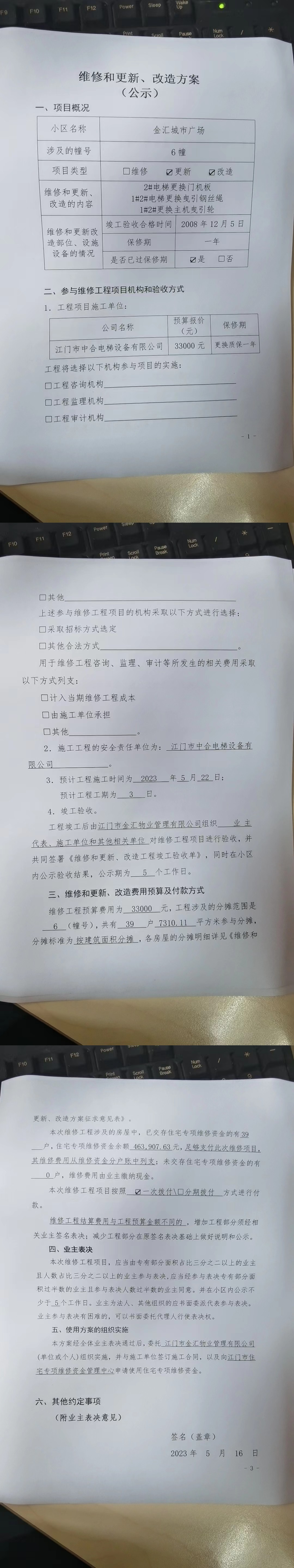 <td valign="top" values="" style="border-width:0" bindtype="0" rowspan="17" colspan="7" datasource="投票结果"><font style=" font-family:方正小标宋简体;font-size:14pt;"><p style="line-height: 1.75em;"><span style="font-family: 宋体, SimSun;">各位尊敬的业主:</span><br></p><p style="text-indent: 2em; line-height: 1.75em;"><span style="font-family: 宋体, SimSun;">根据法律法规的规定,本小区业主利用“物业公共事务决策系统”已对本小区公共事务决策事项进行了表决,在经过7日的询异公示期后,未收到业主有效的异议。现将投票结果公告,并就产生的法律效力说明如下:</span></p><p style="line-height: 1.75em; text-indent: 0em;"><strong style="text-indent: 2em;"><span style="font-family: 宋体, SimSun;">一、投票范围</span></strong></p><p style="text-indent: 2em; line-height: 1.75em;"><span style="font-family: 宋体, SimSun;">金汇城市广场金汇城市广场6栋</span></p><p style="text-indent: 2em; line-height: 1.75em;"><span style="font-family: 宋体, SimSun;">总人数(专有部分人数之和):36</span></p><p style="text-indent: 2em; line-height: 1.75em;"><span style="font-family: 宋体, SimSun;"><span style="font-family: 宋体, SimSun; text-indent: 32px;">总户数:39</span></span></p><p style="text-indent: 2em; line-height: 1.75em;"><span style="font-family: 宋体, SimSun;">建筑物总面积(专有部分面积之和):7310.11㎡</span></p><p style="line-height: 1.75em;"><strong><span style="font-family: 宋体, SimSun;">二、投票起止时间</span></strong></p><p style="text-indent: 2em; line-height: 1.75em;"><span style="font-family: 宋体, SimSun;">投票表决时间:从2023年05月16日到2023年06月05日止</span></p><p style="text-indent: 2em; line-height: 1.75em;"><span style="font-family: 宋体, SimSun;">投票询异公示时间:从2023年06月06日开始</span></p><p style="text-indent: 2em; line-height: 1.75em;"><span style="font-family: 宋体, SimSun;">投票结果通知公告时间:从2023年06月13日开始</span></p><p style="line-height: 1.75em;"><strong><span style="font-family: 宋体, SimSun;">三、计票规则</span></strong></p><p style="text-indent: 2em; line-height: 1.75em;"><span style="font-family: 宋体, SimSun;">表决事项:使用建筑物及其附属设施的维修资金<br></span></p><p style="font-family: 宋体, SimSun;line-height: 1.75em; text-indent: 2em;">计票规则:弃权票不并入其它项 未表决票不并入其它项</p><p></p><p style="line-height: 1.75em;"><strong><span style="font-family: 宋体, SimSun;">四、通过规则</span></strong></p><p style="text-indent: 2em; line-height: 1.75em;"><span style="font-family: 宋体, SimSun;"><span style="font-family: 宋体, SimSun; text-indent: 32px;">表决事项:使用建筑物及其附属设施的维修资金<br></span></span></p><p style="font-family: 宋体, SimSun;line-height: 1.75em; text-indent: 2em;">通过规则:参与表决专有部分面积过半数的业主且参与表决人数过半数的业主同意</p><p></p><p style="line-height: 1.75em;"><strong><span style="font-family: 宋体, SimSun;">五、投票结果</span></strong></p><p style="line-height: 1.75em; text-indent: 2em;"><span style="font-family: 宋体, SimSun; text-indent: 2em;"></span></p><div id="resultTable"><table style="table-layout: fixed; font-size:12px; margin-top:10px" width="100%" border="0" cellspacing="0" cellpadding="0"><tbody><tr><td height="28" colspan="10" align="center" style="border: 1px solid #666"><strong style="font-size: 14px;"> 使用建筑物及其附属设施的维修资金</strong></td> </tr><tr id="trfirst"><td height="28" colspan="4" style="border-left: 1px solid #666; border-bottom: 1px solid #666"><strong> 申报单位:</strong> 江门市金汇物业管理有限公司</td><td colspan="3" style="border-left: 1px solid #666; border-bottom: 1px solid #666"><strong> 联系方式:</strong> 3929093 </td><td colspan="3" style="border-left: 1px solid #666; border-bottom: 1px solid #666; border-right: 1px solid #666"><strong> 申报日期:</strong> 2023年5月16日 </td></tr><tr> <td height="28" colspan="5" style="border-left: 1px solid #666; border-bottom: 1px solid #666"><strong> 总人数(专有部分人数之和):</strong>36人 </td><td colspan="5" style="border-left: 1px solid #666; border-bottom: 1px solid #666; border-right: 1px solid #666"><strong> 建筑物总面积(专有部分面积之和):</strong>7310.11㎡ </td> </tr><tr><td height="28" colspan="10" bgcolor="#F3F3F3" style="border-left: 1px solid #666;border-bottom: 1px solid #666;border-right: 1px solid #666"><strong> 参与人数及面积统计</strong></td></tr><tr><td height="28" colspan="5" style="border-left: 1px solid #666; border-bottom: 1px solid #666"><strong> 参与表决专有部分人数之和:</strong>26人</td><td colspan="5" style="border-left: 1px solid #666; border-bottom: 1px solid #666; border-right: 1px solid #666"><strong> 参与表决占有表决权总人数比例:</strong>72.22%</td></tr><tr><td height="28" colspan="5" style="border-left: 1px solid #666; border-bottom: 1px solid #666"><strong> 参与表决专有部分面积之和:</strong>5428.41㎡</td><td colspan="5" style="border-left: 1px solid #666; border-bottom: 1px solid #666; border-right: 1px solid #666"><strong> 参与表决占有表决权总面积比例:</strong>74.26%</td></tr><tr><td height="28" colspan="10" bgcolor="#F3F3F3" style="border-left: 1px solid #666; border-bottom: 1px solid #666;border-right: 1px solid #666"> <strong> 未参与人数及面积统计</strong></td> </tr><tr><td height="28" colspan="5" style="border-left: 1px solid #666; border-bottom: 1px solid #666"><strong> 未参与表决专有部分人数之和:</strong>10人 </td><td colspan="5" style="border-left: 1px solid #666; border-bottom: 1px solid #666; border-right: 1px solid #666"><strong> 未参与表决占有表决权总人数比例:</strong>27.78%</td></tr><tr><td height
