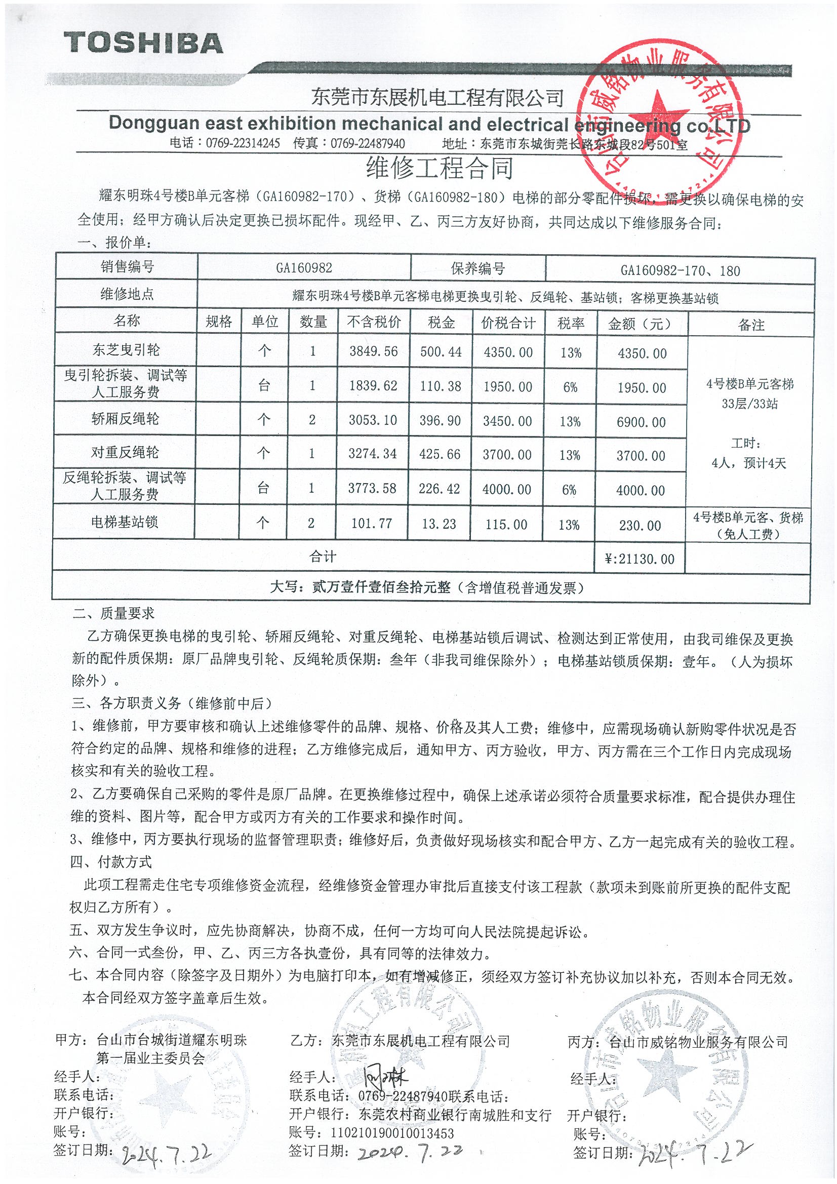 <td VALIGN="top" VALUES="" STYLE="border-width:0" BINDTYPE="0" ROWSPAN="19" COLSPAN="7" DATASOURCE="投票结果" ><font style="font-size:14pt;"><p style="white-space: normal; font-family: 宋体; line-height: 1.75em;">耀东明珠花园4号楼B座全体业主:</p><p style="white-space: normal; font-family: 宋体; line-height: 1.75em; text-indent: 2em;">本小区关于耀东明珠花园4号楼B座客梯更换曳引轮、反绳轮、基站锁,货梯更换基站锁使用维修资金投票的投票已表决结束,询异时间从2024年08月11日开始,投票询异公示期间,业主可通过微信查询自己的表决情况或可凭身份证件申请查询自己的表决情况;如公示的业主表决情况与查询的本人表决意见不一致的,可以以书面形式向投票组织机构申诉,投票组织机构予以纠正并重新公示表决结果。异议提出人对投票组织机构的处理仍有异议的,可以向街道办事处(镇人民政府)反映处理,涉及住宅专项维修资金的,可向属地住宅专项维修资金管理中心反映处理。</p><p style="white-space: normal;"><br/></p><p style="white-space: normal; font-family: 宋体; line-height: 1.75em;"><strong>附件:</strong></p><p style="white-space: normal; font-family: 宋体; line-height: 1.75em;"><strong>一、投票范围</strong></p><p style="white-space: normal; font-family: 宋体; line-height: 1.75em; text-indent: 2em;">耀东明珠花园4号楼B座</p><p style="white-space: normal; font-family: 宋体; line-height: 1.75em; text-indent: 2em;">总人数(专有部分人数之和):116</p><p style="white-space: normal; font-family: 宋体; line-height: 1.75em; text-indent: 2em;"><span style="font-family: 宋体, SimSun;"><span style="font-family: 宋体; text-indent: 32px;"><span style="font-family: 宋体; text-indent: 32px;">总户数:120</span></span></span></p><p style="white-space: normal; font-family: 宋体; line-height: 1.75em; text-indent: 2em;">建筑物总面积(专有部分面积之和):16639.80㎡</p><p style="white-space: normal; font-family: 宋体; line-height: 1.75em;"><strong>二、询异公示起止时间</strong></p><p dir="ltr" style="white-space: normal; font-family: 宋体; line-height: 1.75em; text-indent: 2em;"><span style="text-indent: 36px;">2024年08月11日至2024年08月17日</span></p><p style="white-space: normal; font-family: 宋体; line-height: 1.75em;"><strong>三、投票详细描述</strong></p><p style="white-space: normal; font-family: 宋体; line-height: 1.75em; text-indent: 2em;"><p style="text-indent: 2em;"><span style="font-size: 14px; text-wrap: wrap; background-color: rgb(255, 255, 255); font-family: 宋体;">小区</span><span style="font-size: 14px; text-wrap: wrap; font-family: 宋体; background: rgb(255, 255, 0);">4号楼B座的客梯运行时出现异响,经检查,是由于客梯曳引轮老化磨损严重,第7条绳槽有凹槽现象,导致第7条钢丝绳磨损严重,运行时异响较大,需更换曳引轮1个。客梯2个轿厢反绳轮和1个对重反绳轮也存在老化磨损的现象,建议一并更换;客梯、货梯的基站锁已损坏,需更换两台电梯的基站锁。</span></p><p style="text-indent: 2em;"><span style="font-size: 14px; text-wrap: wrap; background-color: rgb(255, 255, 255); font-family: 宋体;">现对</span><span style="font-size: 14px; text-wrap: wrap; font-family: 宋体; background: rgb(255, 255, 0);">4号楼B座的客梯、货梯进行维修,工程维修预算金额为21130元,项目最终费用以施工合同签订金额为准。因已过保修期,维修费用由相关业主按建筑面积分摊,每平方约1.27元,详见公示附件。如业主手机不能正常通过微信投票,请联系物业公司进行线下纸质投票,物业电话:0750-5586289</span><span style="font-size: 14px; text-wrap: wrap; background-color: rgb(255, 255, 255); font-family: 宋体;">。</span></p></p><p style="white-space: normal; font-family: 宋体; line-height: 1.75em;"><strong>四、计票规则</strong></p><p style="white-space: normal; font-family: 宋体; line-height: 1.75em; text-indent: 2em;">表决事项:使用建筑物及其附属设施的维修资金<br /><p style='text-align: left; font-family: 宋体; font-size: 16px; line-height: 1.75em; text-indent: 2em;'>计票规则:弃权票不并入其它项 未表决票不并入其它项</p></p><p style="white-space: normal; font-family: 宋体; line-height: 1.75em;"><strong>五、通过规则</strong></p><p style="white-space: normal; font-family: 宋体; line-height: 1.75em;"><strong><strong style="white-space: normal;"><span style="font-family: 宋体, SimSun;"> 根据《中华人民共和国民法典》第二百七十八条规定:业主共同决定事项,应当由专有部分面积占比三分之二以上的业主且人数占比三分之二以上的业主参与表决。</span></strong></strong></p><p style="white-space: normal; font-family: 宋体; line-height: 1.75em; text-indent: 2em;">表决事项:使用建筑物及其附属设施的维修资金<br /><p style='text-align: left; font-family: 宋体; font-size: 16px; line-height: 1.75em; text-indent: 2em;'>通过规则:双2/3以上参与表决,参与表决双过半同意</p></p><p style="white-space: normal; font-family: 宋体; line-height: 1.75em;"><strong>六、投票结果</strong></p><p style="white-space: normal; font-family: 宋体; line-height: 1.75em; text-indent: 2em;"><div id='resultTable'><table style='table-layout: fixed; font-size:12px; margin-top:10px' width='100%' border='0' cellspacing='0' cellpadding='0'><tr><td height='28' colspan='10' align='center' style='border: 1px solid #666'><strong style='font-size: 14px;'> 使用建筑物及其附属设施的维修资金</strong></td> </tr><tr id='trfirst'><td height='28' colspan='4' style='border-left: 1px solid #666; border-bottom: 1px solid #666'><strong> 申报单位:</strong> 台山市威铭物业服务有限公司</td><td colspan='3' style='border-left: 1px solid